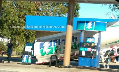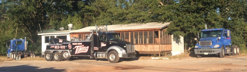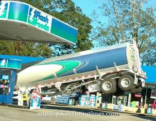 The tractor to the left of the tow truck was hauling the tanker but experienced mechanical failure. When the stands were deployed and the tractor was removed by the tow truck, the fuel located in the front and middle sections of the tanker caused the tanker to tip. (See photo below this article courtesy of the Pike County Fire Department.)